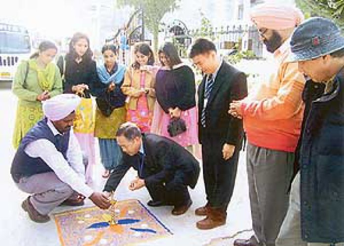 A Korean teacher lights a lamp in Mount View Public School at Zirakpur on Sunday. |